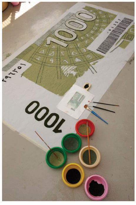 Each mandala depicted the currencies of the countries and contexts in which they were created. While producing the labour intensive sand dollars I interacted with audiences, discussing the transient nature of money, art and material goods in our societies. The sites I worked at ranged from Beirut to the Vancouver 2010 Winter Olympic Games.